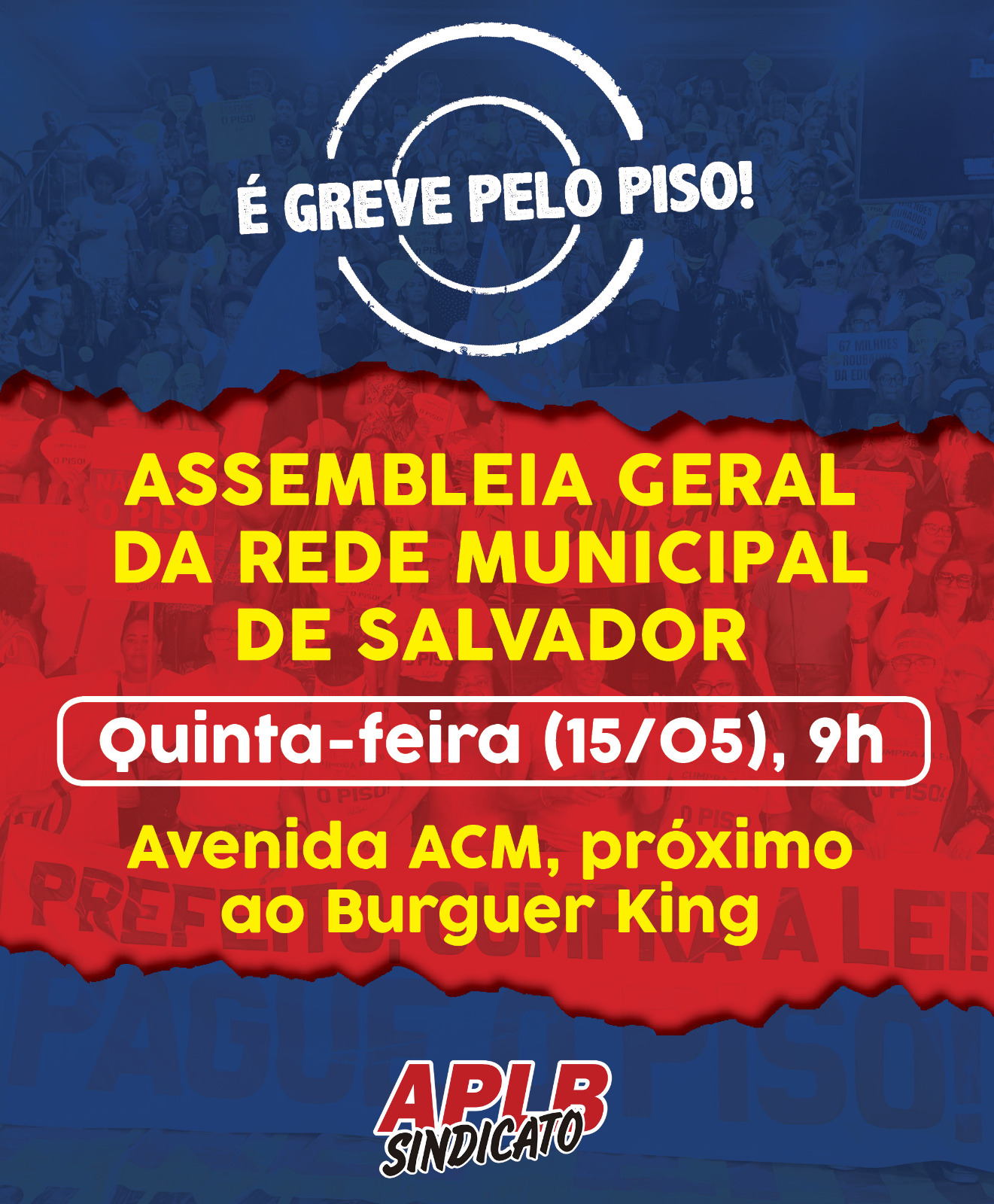 A direção da APLB-Sindicato convoca os professores da Rede Municipal de Ensino de Salvador para Assembleia nesta quinta-feira (15/05), AMANHÃ, às 9h, na Avenida ACM, próximo ao Burguer King e ao antigo Hiper.