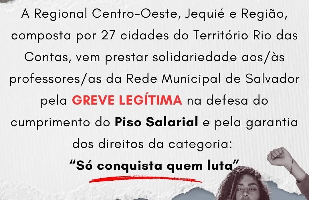 A REGIONAL CENTRO-OESTE, JEQUIÉ E REGIÃO, SE SOLIDARIZA COM OS/AS PROFESSORES/AS DA REDE MUNICIPAL DE SALVADOR.