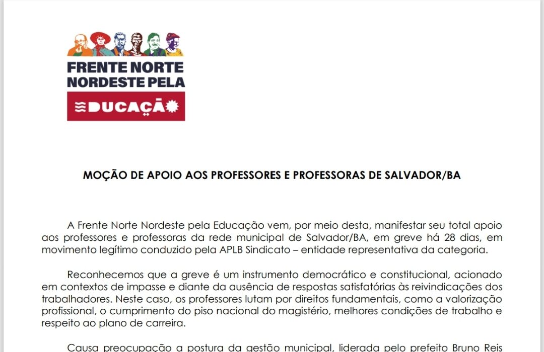 A Frente Norte Nordeste pela Educação divulgou, nesta segunda-feira (2), uma moção de apoio à greve dos professores e professoras da rede municipal de Salvador, que já chega ao 28º dia de paralisação. O movimento, conduzido pela APLB Sindicato, é descrito pela entidade como legítimo e necessário diante da falta de diálogo efetivo da gestão