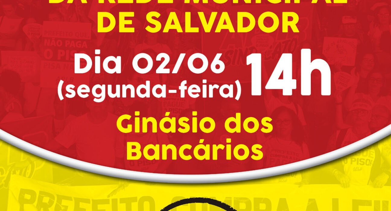 ATENÇÃO, EDUCADORAS E EDUCADORES DA REDE MUNICIPAL DE SALVADOR! A nossa luta continua firme! Na segunda-feira, 2 de junho, teremos assembleia geral da rede municipal às 14h, no Ginásio de Esportes dos Bancários. É momento de união e decisão! Vamos juntos debater os rumos da greve e fortalecer a mobilização pelo cumprimento da Lei do