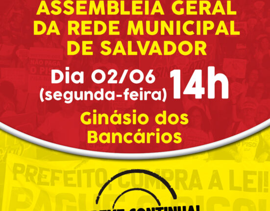 ATENÇÃO, EDUCADORAS E EDUCADORES DA REDE MUNICIPAL DE SALVADOR! A nossa luta continua firme! Na segunda-feira, 2 de junho, teremos assembleia geral da.