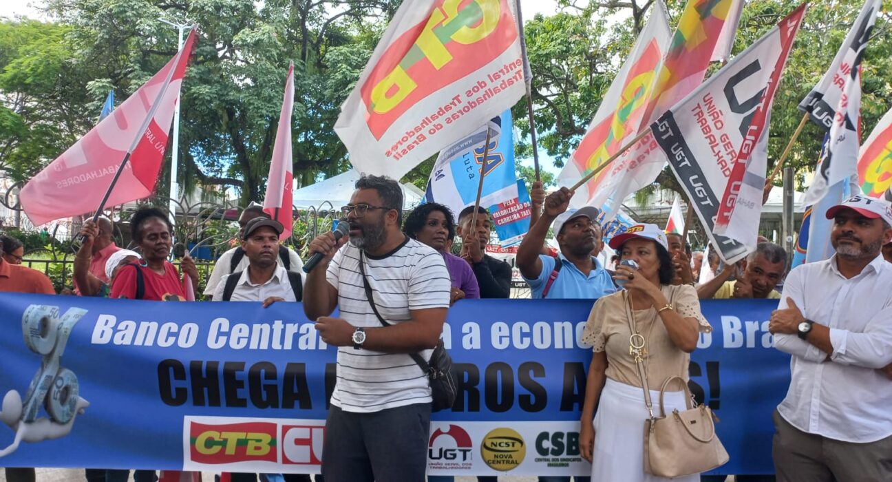 A APLB-Sindicato participou, na Praça da Piedade, em Salvador, nesta terça-feira (18/03) – data em que o Comitê de Política Monetária (Copom) do Banco Central (BC) se reúne para anunciar a taxa de juros da economia brasileira (Selic) – do ato pela redução dos juros no país. Atualmente, a taxa Selic está em 13,25%, uma