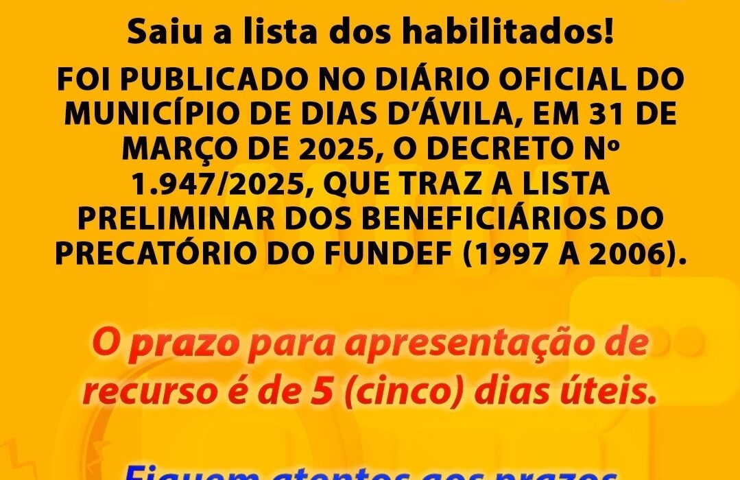 Informe sobre Precatórios Saiu a lista dos habilitados! Foi publicado no Diário Oficial do Município de Dias D’Ávila, em 31 de março de 2025, o Decreto n° 1.947/2025, que traz a lista preliminar dos beneficiários do precatório do FUNDEF (1997 a 2006). ○ 0 prazo para apresentação de recurso é de 5 (cinco) dias úteis.