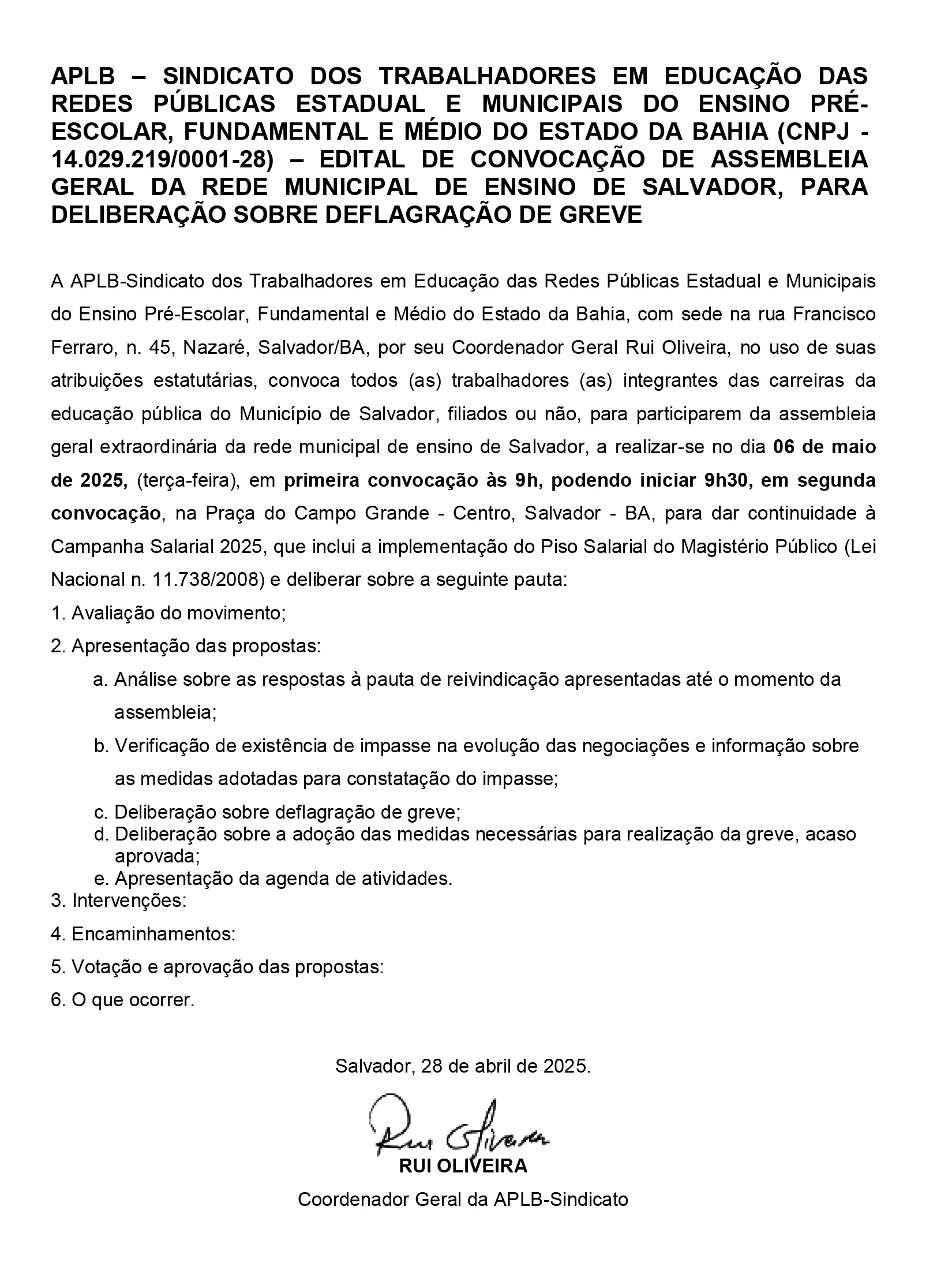 educação pública do Município de Salvador, filiados ou não, para participarem da assembleia geral extraordinária da rede municipal de ensino de Salvador, a realizar-se no dia 06 de maio de 2025, (terça-feira), em primeira convocação às 9h, podendo iniciar 9h30, em segunda convocação, na Praça do Campo Grande – Centro, Salvador – BA, para dar continuidade à
