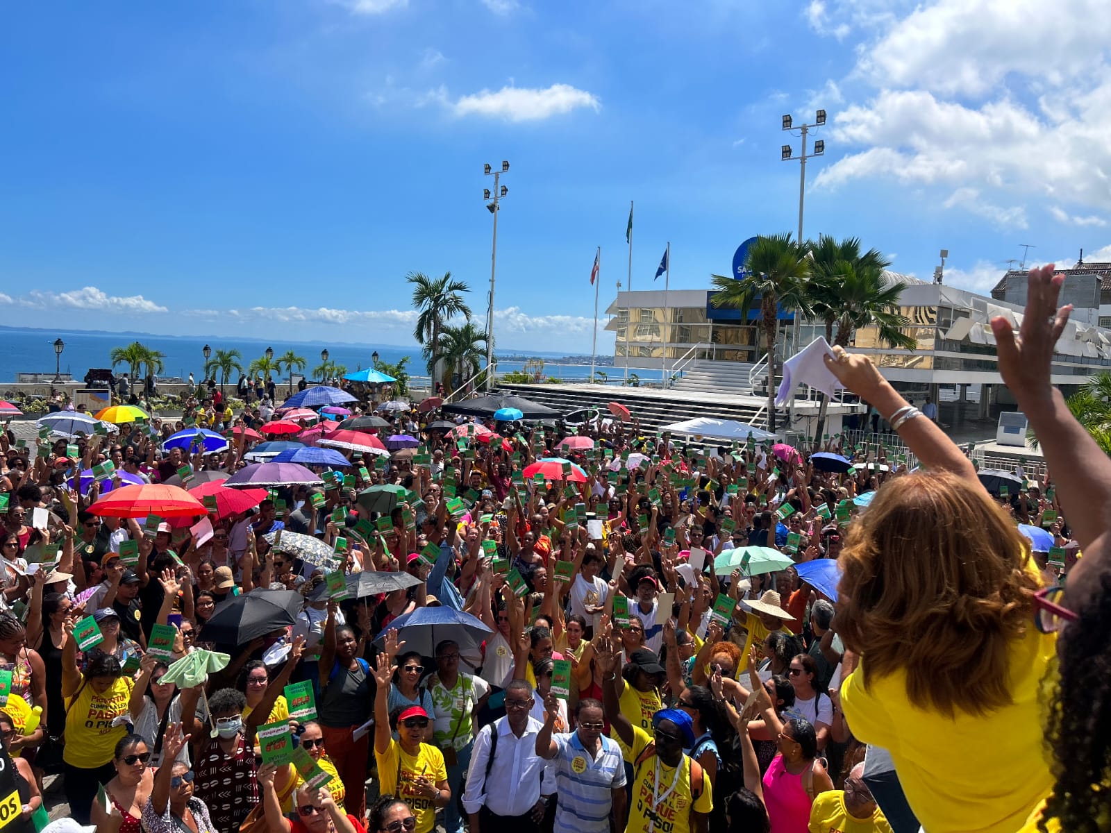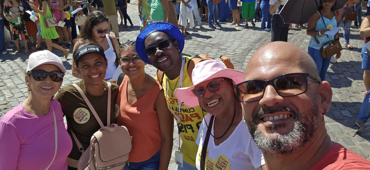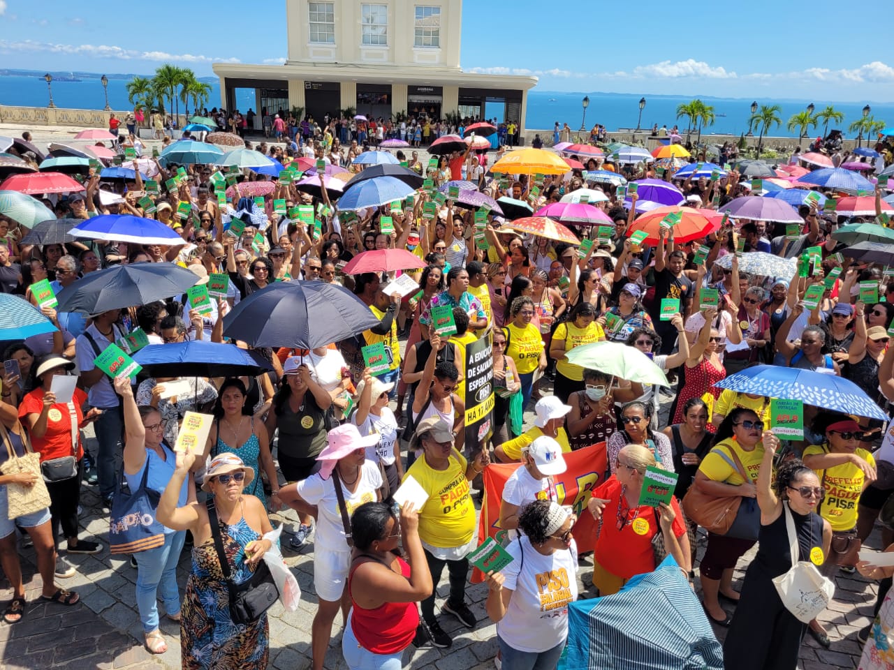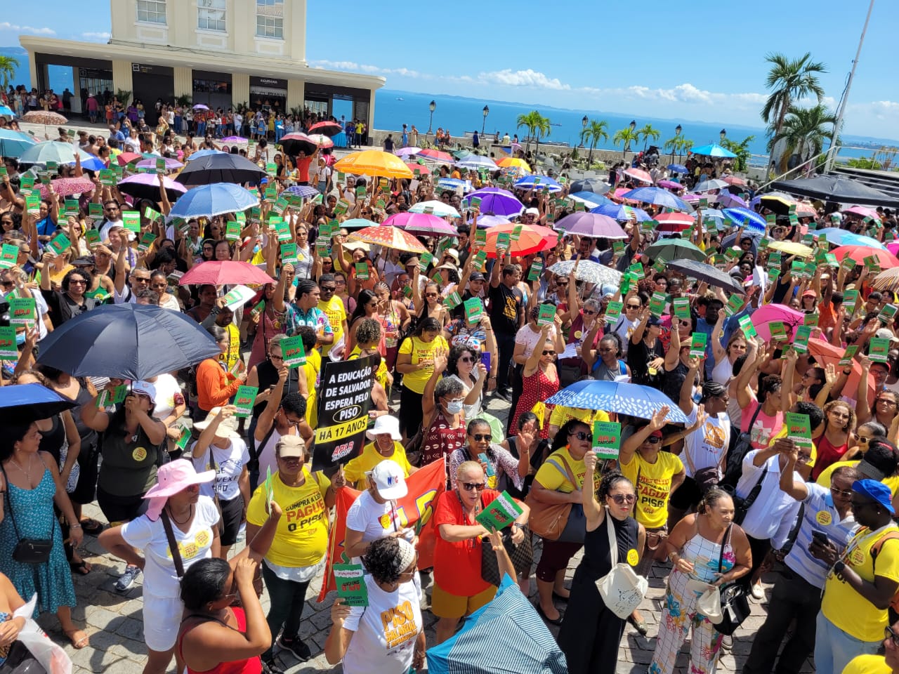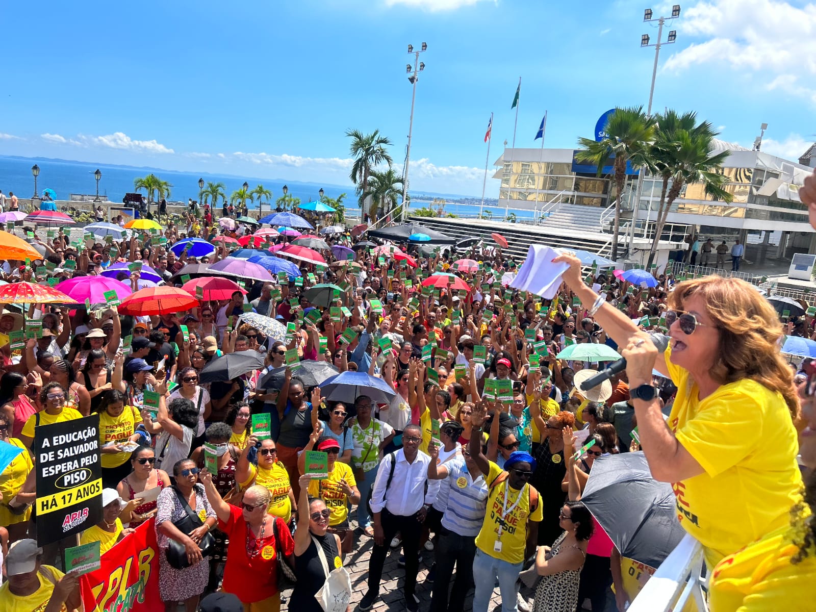 Na manhã desta terça-feira (15), a Praça Municipal, no Centro de Salvador, foi tomada pela força e união dos educadores da rede municipal de Salvador durante mais uma assembleia convocada pela APLB-Sindicato. O ato faz parte da Campanha Salarial 2025 e demonstrou a insatisfação da categoria diante da falta de diálogo e do não cumprimento da Lei do Piso Salarial por parte da Prefeitura.