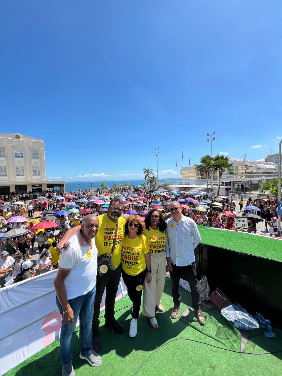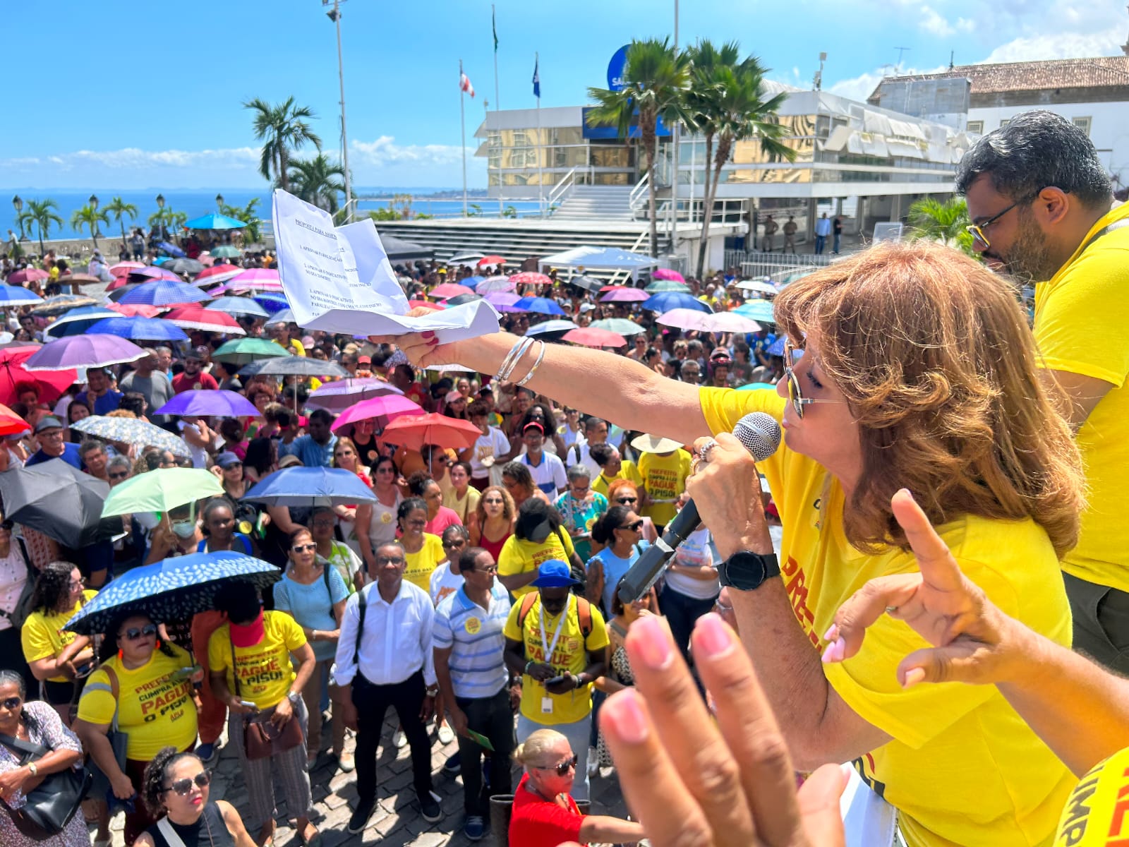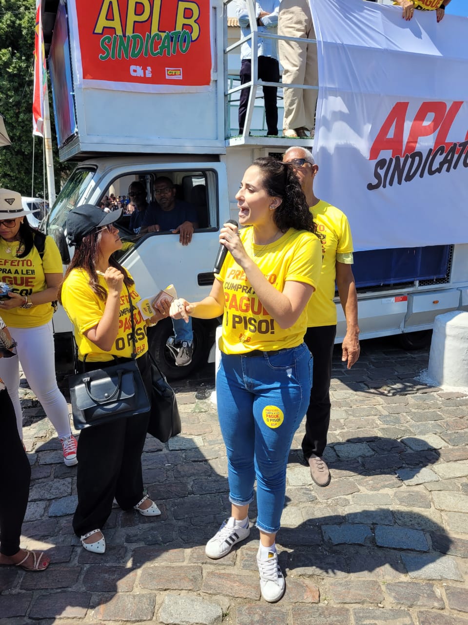 “Hoje, a Praça Municipal se encheu de vozes unidas em defesa da educação. A falta de diálogo e o não cumprimento da Lei do Piso Salarial não podem ser ignorados. Estamos aqui para reafirmar que a valorização dos educadores é uma prioridade e não vamos desistir de lutar por nossos direitos.”, afirmou Elza Melo, diretora da APLB-Sindicato.
