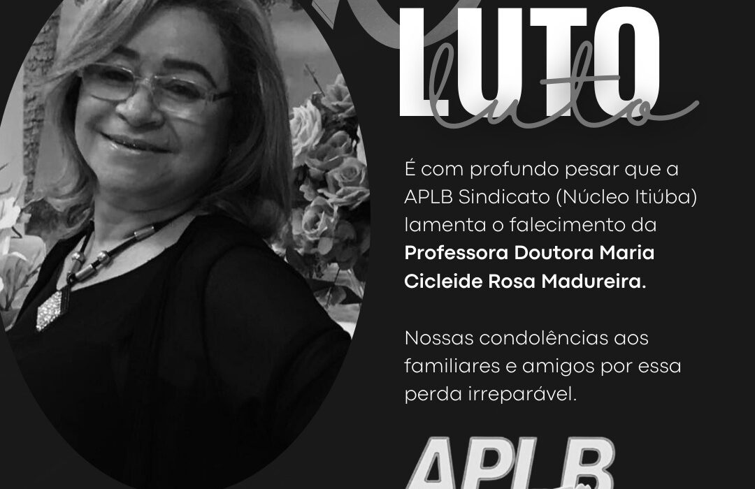 A direção da APLB-Sindicato lamenta profundamente a morte da professora Maria Cicleide Rosa Madureira nesta segunda-feira (14/04). Manifestamos nossa solidariedade ao Núcleo de Itiúba, assim como aos familiares e amigos da companheira. Nossa homenagem por sua garra e força em defesa da Educação!
