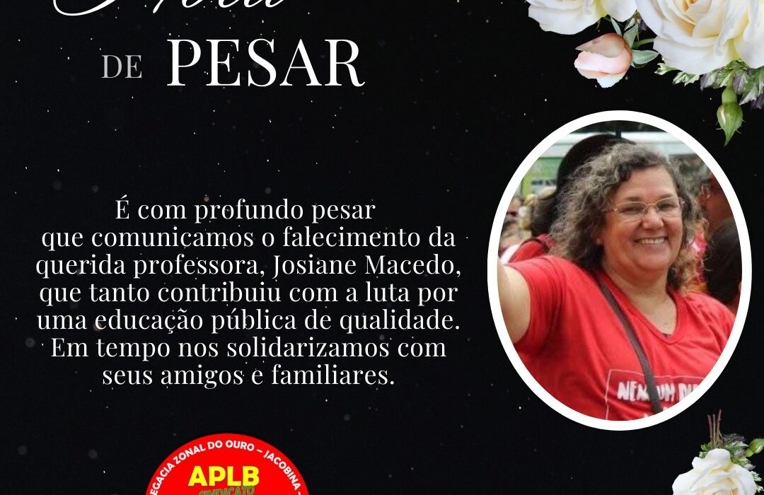 Com pesar a direção da APLB-Sindicato informa o falecimento da professora Josiane Macedo. Que os familiares e amigos possam ter serenidade neste momento difícil.