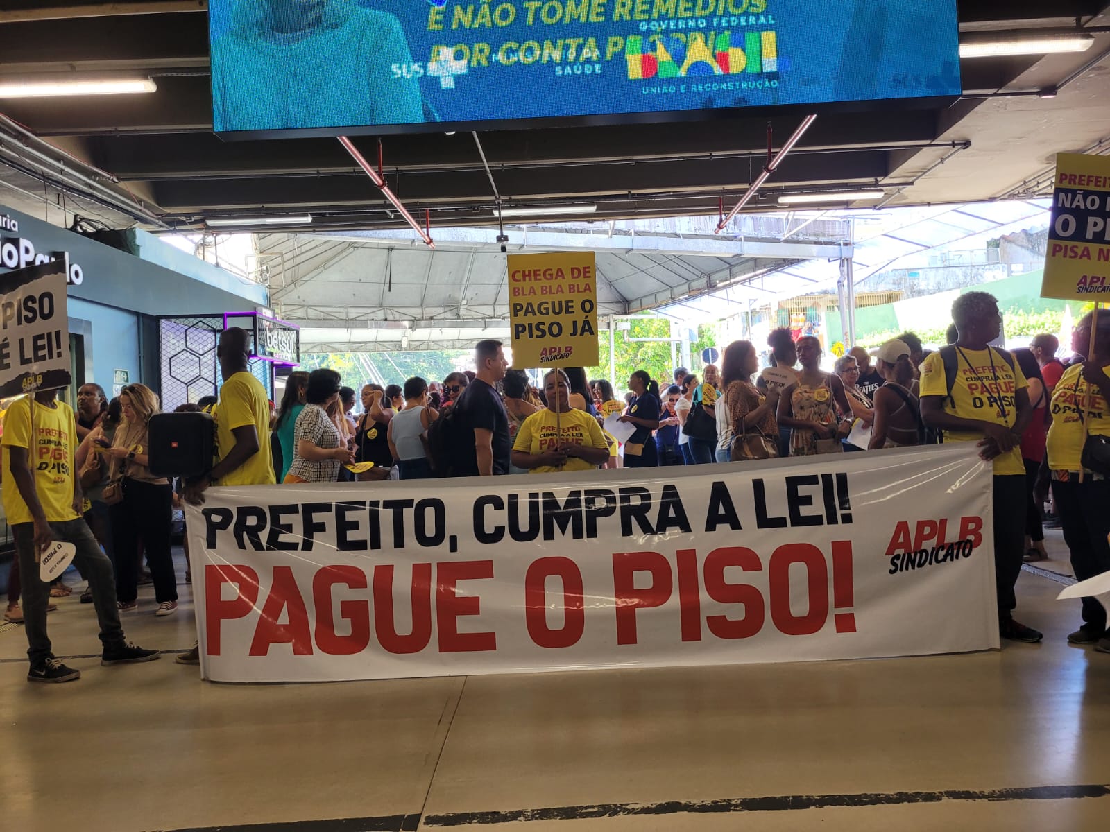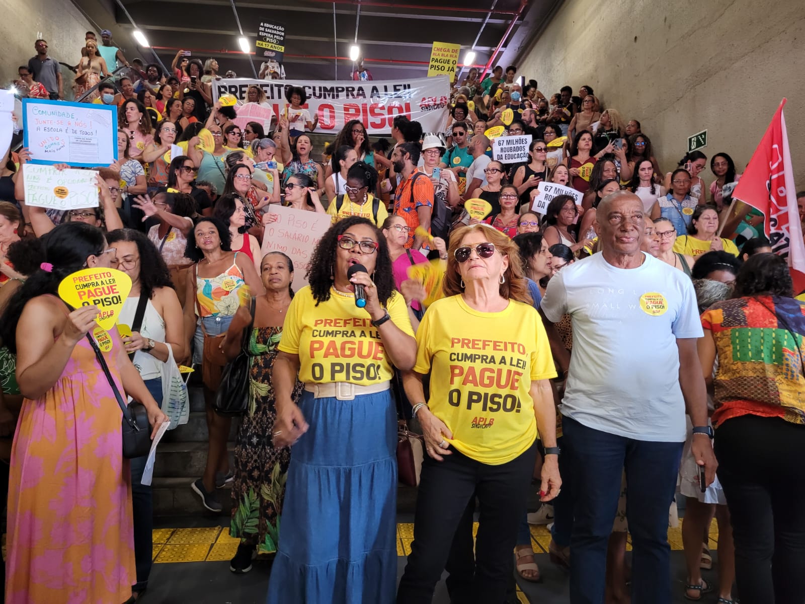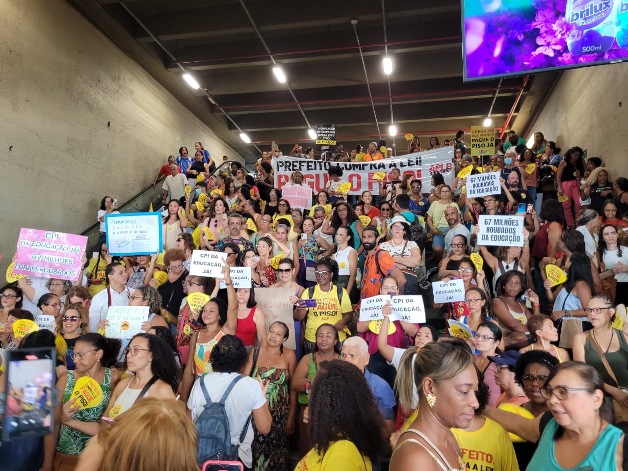 Durante toda a manhã desta terça-feira (29), as escadarias da Estação da Lapa foram tomadas por professores da rede municipal de ensino de Salvador. Em mais uma atividade da agenda de mobilizações, a APLB Sindicato dos Trabalhadores em Educação realizou a *Feira de Denúncias*, chamando atenção da população para o descaso da gestão do prefeito Bruno Reis com a educação pública.
