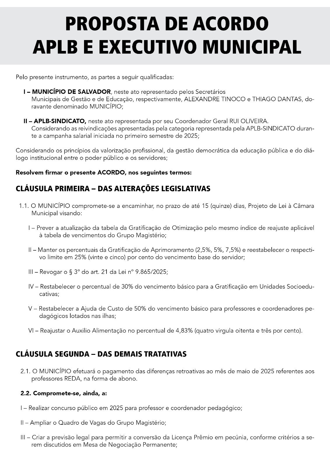 A direção da APLB-Sindicato apresenta abaixo a proposta de acordo discutida entre a APLB e o executivo municipal na reunião de negociação realizada na terça-feira (17/06), na SMED. Essa proposta será levada para ser apreciada pela categoria na assembleia geral desta quarta-feira (18/06), às 14h, no Ginásio de Esportes dos Bancários.