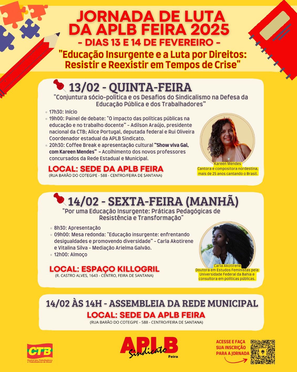 Entre os dias 13 e 14 de fevereiro de 2025, a APLB-Sindicato Feira promove a Jornada de Luta com o tema “Educação Insurgente e a Luta por Direitos: Resistir e Reexistir em Tempos de Crise”, reunindo educadores, representantes sindicais e autoridades para debater as questões urgentes que afetam a educação pública e os direitos dos trabalhadores da educação.