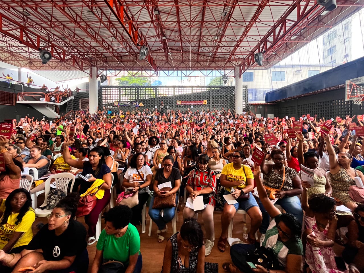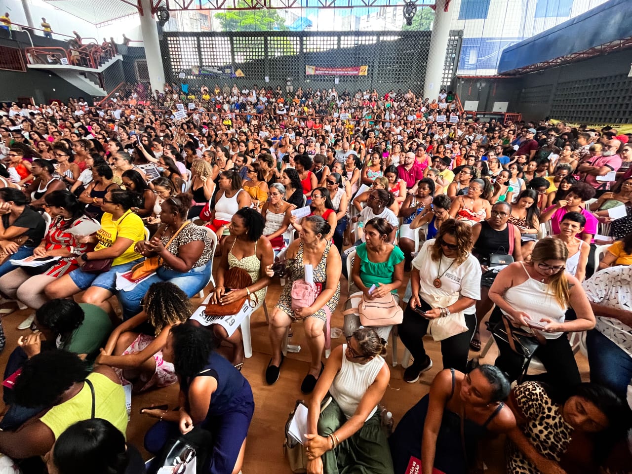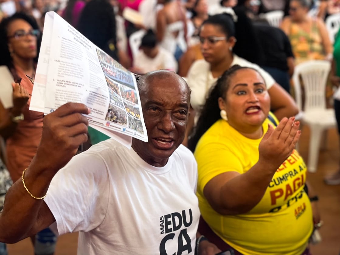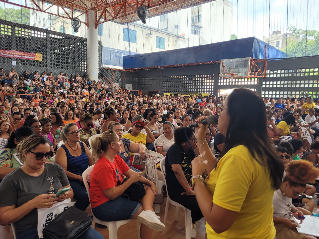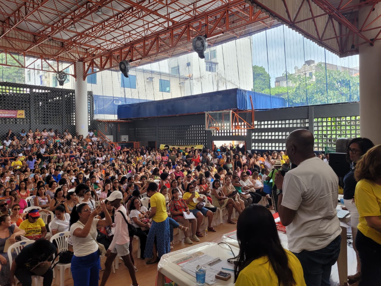 Ginásio de Esportes dos Bancários ficou pequeno para a força da categoria! Em assembleia massiva realizada nesta terça-feira (1º), os trabalhadores em educação da rede municipal de Salvador aprovaram **paralisação de 72 horas e estado de greve**, reforçando a mobilização por reajuste salarial e melhores condições de trabalho. A atividade faz parte da Campanha Salarial da categoria e contou com a participação expressiva dos educadores, que deram um recado claro à gestão municipal: **valorização já!**